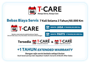 Lewat program promo T-CARE, Toyota memberikan pelayanan kepada Toyota Friends untuk mendapatkan Bebas Biaya Service sebanyak 7x selama kurun waktu 3 tahun/60.000 km.
