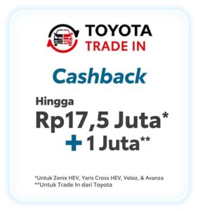 Tersedia juga program Toyota Trade In menawarkan Toyota Friends untuk berkesempatan mendapatkan Cashback hingga Rp17,5 juta untuk Zenix HEV, Yaris Cross HEV, Veloz & Avanza + 1 Juta untuk Trade In dari Toyota.